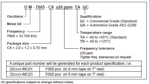 OM-7605-C8-32.768kHz-20PPM-TA-QC,微晶晶振 編碼說明
