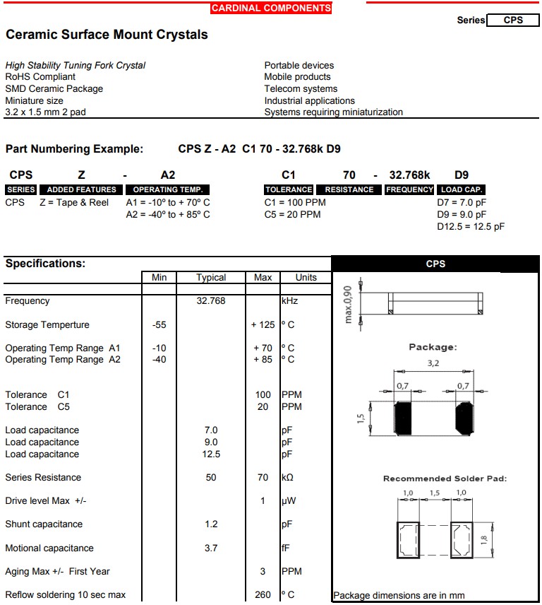 Cardinal晶振CPS系列,編碼CPSZ-A2C170-32.768kD9,頻率:32.768k晶振,無源晶振,小體積晶振微型尺寸:3.2x1.5mm,SMD陶瓷封裝,兩腳貼片晶振,陶瓷表面貼裝晶體,石英晶體諧振器,高穩定性音叉晶體,通過無鉛認證