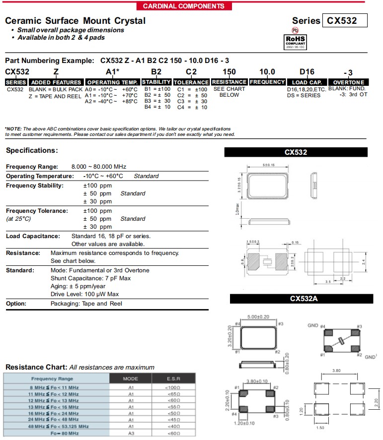美國Cardinal卡迪納爾晶振CX532,是一款小體積晶振尺寸5.0x3.2mm陶瓷表面貼裝晶體,整體封裝尺寸小,CX532晶振2個襯墊和CX532A晶振4個襯墊可供選擇,無源晶振,石英晶振,貼片晶振,石英晶體諧振器,頻率范圍:8MHz-80MHz,頻率穩定度:±30ppm,無鉛環保晶振,具有超小型,輕薄型,耐熱及耐環境特點,進口晶振,被廣泛用于通訊設備,無線網絡,藍牙模塊,汽車電子,醫療設備,數碼電子,平板電腦,物聯網應用等。醫療設備應用晶振CX532Z-A2B3C5-70-1966080D18