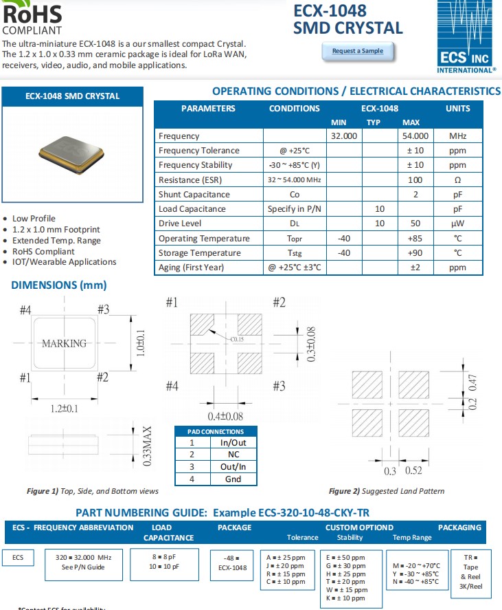 ECS的超微型ECX-1048晶振,小體積晶振尺寸1.2x1.0x0.33mm四腳貼片晶振,無源晶振,石英晶體諧振器,陶瓷封裝,ECS-240-8-48-CKY-TR緊湊型晶體非常適合LoRa WAN應用, 接收器、視頻,可穿戴設備,音頻和移動通訊等應用。