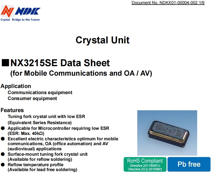 日本進口NDK晶振NX3215SE,編碼為NX3215SE-32.768K-STD-MUA-19用于移動通信和辦公自動化,小體積尺寸3.2x1.5mm兩腳貼片晶振,32.768K晶振,無源晶振,石英晶體諧振器,具有低ESR(等效系列電阻)的石英晶振,適用于需要低ESR的微控制器(ESR: Max,40kΩ)音叉晶體單元,卓越的電氣特性,適用于移動通信、OA(辦公自動化)的最佳電氣特性和AV(視聽)應用,表面安裝音叉晶體單元(可用于回流焊),回流溫度輪廓(可用于無鉛焊接)。