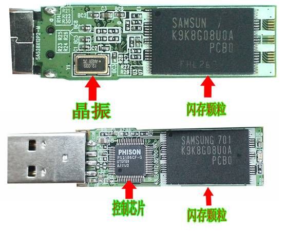 我們了解一下閃存內(nèi)部的結(jié)構(gòu),分為PCB,也就是印刷電路板,上面有閃存顆粒,控制芯片,晶振等元件。其中PCB上面的閃存顆粒就是起到存儲數(shù)據(jù)的作用;而晶振是用來產(chǎn)生原始的時鐘頻率,這個頻率會通過時鐘放大器變成我們常見的各種總線頻率,在我們的電腦主板很常見,另外玩具手表,電子跳繩,手機(jī),計算機(jī),安防,汽車等產(chǎn)品都可以見到。控制芯片則是閃存卡中起著決定性作用的東西。比如我們這個閃存是USB2.0的,速度最高可以達(dá)到多少都是由它說了算。此外,一些PCB板,電容,電阻之類的小元件質(zhì)量則是與做工用料有關(guān)。看右邊這張圖,你就明白它的內(nèi)部結(jié)構(gòu)了。